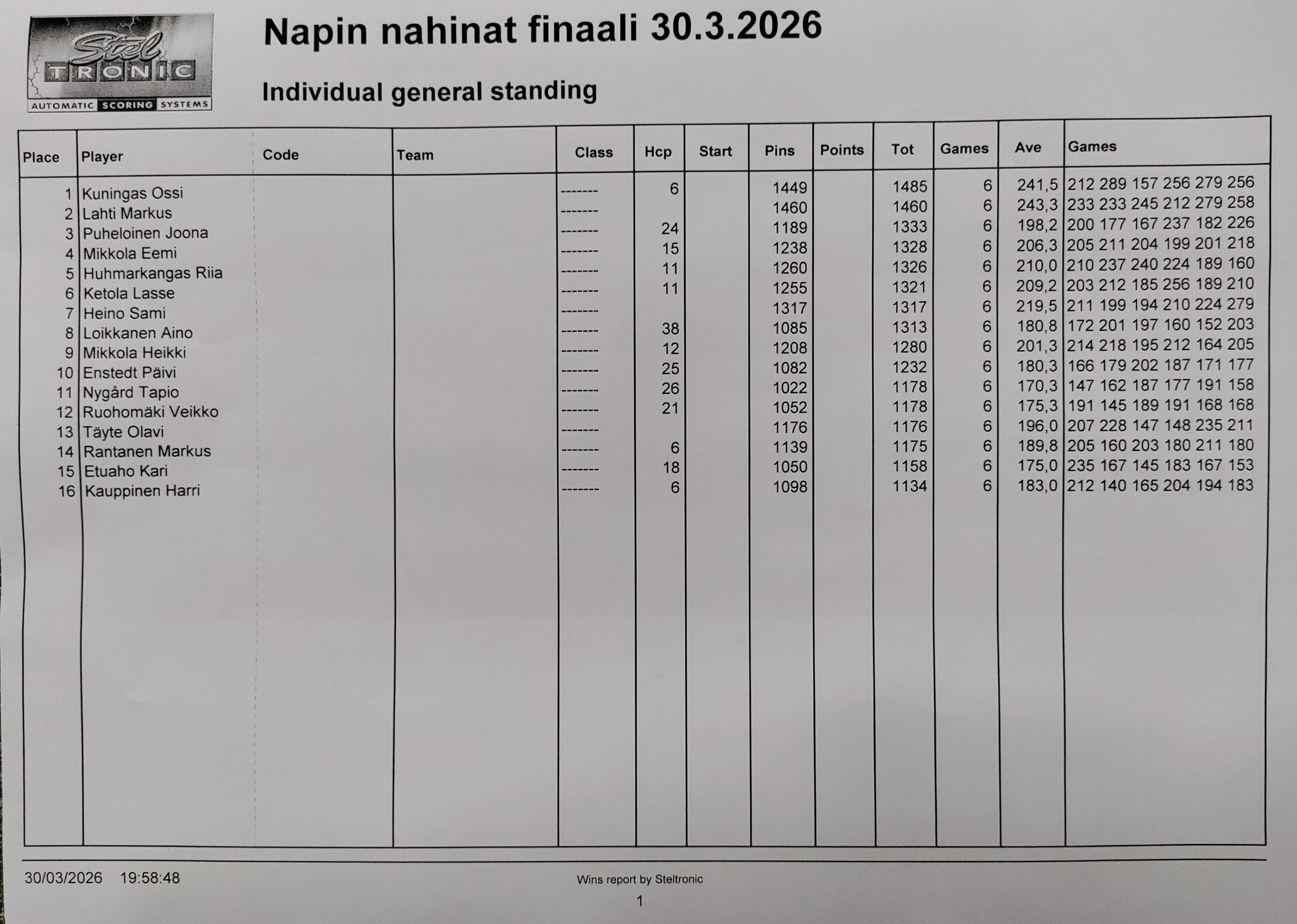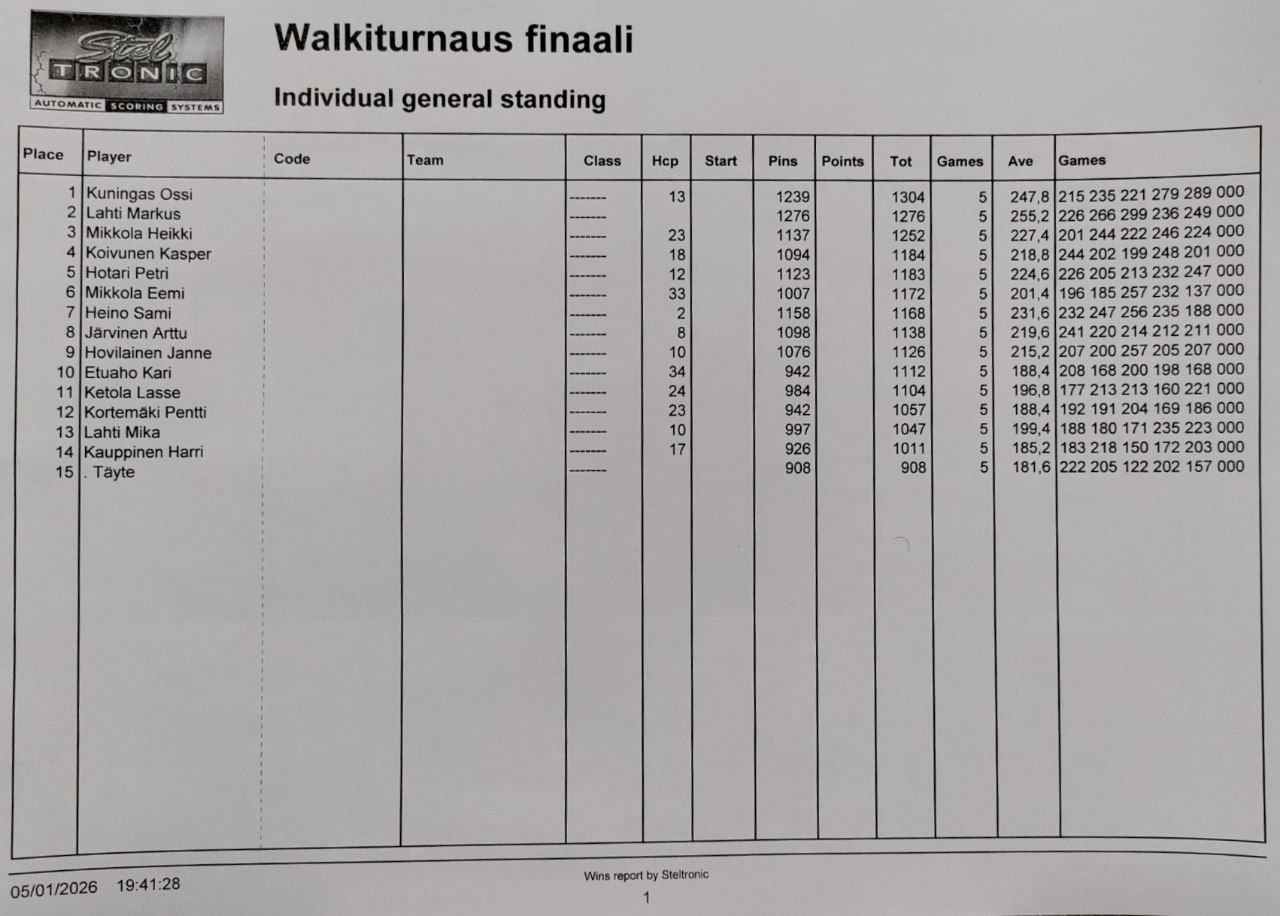 Profiilikisan finaalin tulokset